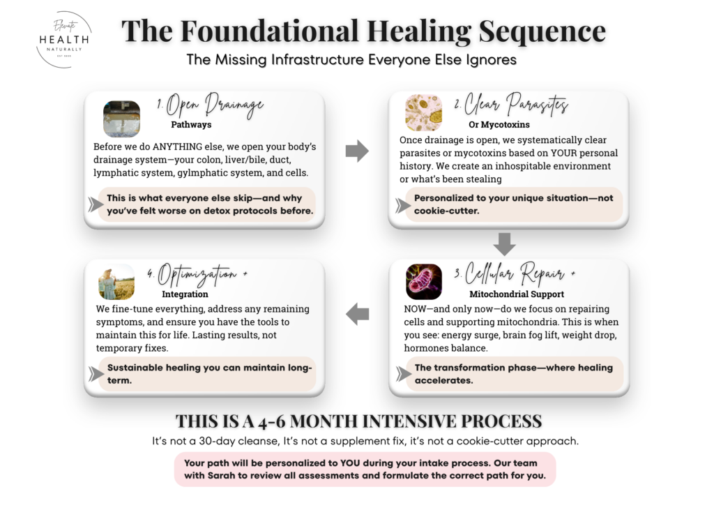 Foundational Medicine is about the right SEQUENCE. Drainage first. Then parasites or mycotoxins. Then heavy metals and toxins. Then cellular repair. Every step prepares your body for the next. Skip a step or do them out of order, and you plateau.