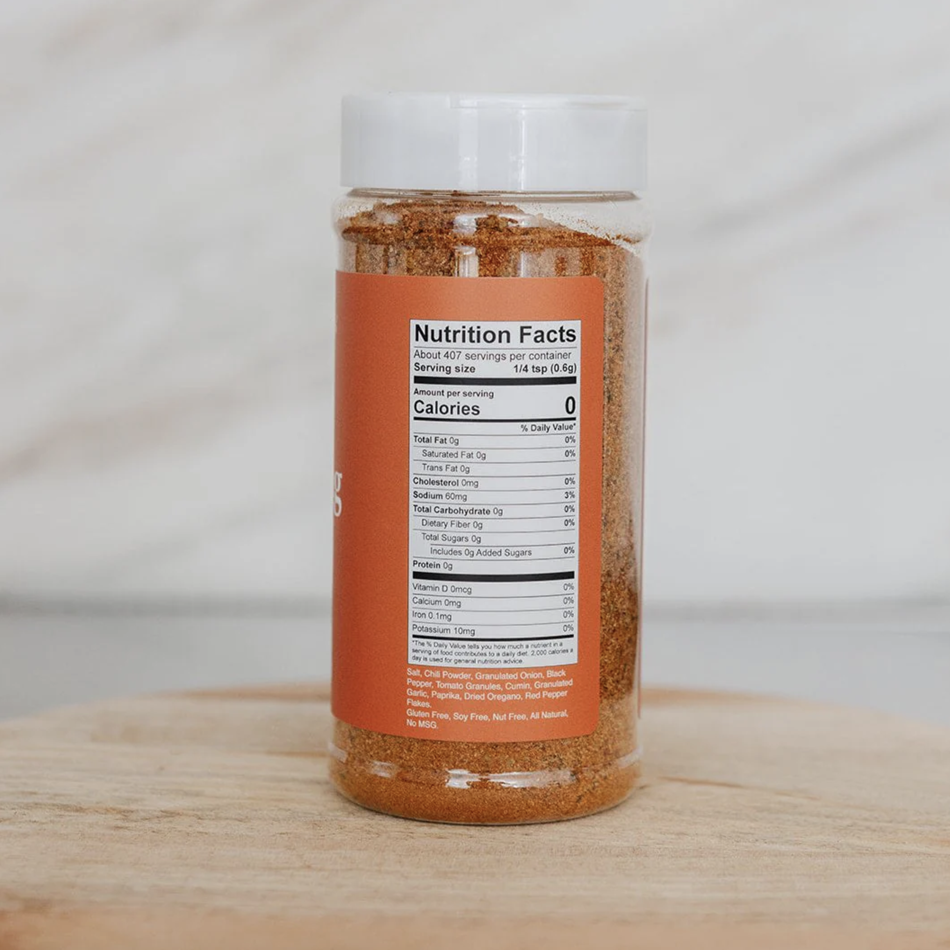 Salt, Chili Powder, Granulated Onion, Black Pepper, Tomato Granules, Cumin, Granulated Garlic, Paprika, Dried Oregano, Red Pepper Flakes.