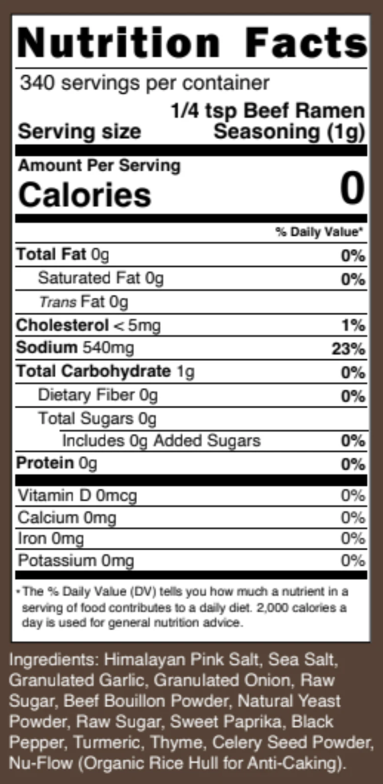 Correction Notice: Recently, we discovered an error on our Beef Ramen Seasoning Nutrition Facts Panel, which listed the sodium content as 540mg per serving. The good news is that that number is far from accurate — our seasoning contains just 170mg of sodium per serving, making it even better for your pantry than you thought! We sincerely apologize for any confusion this may have caused. Transparency and trust mean everything to us, and we’re already working to correct this on future packaging so it reflects the care we put into every bottle.
