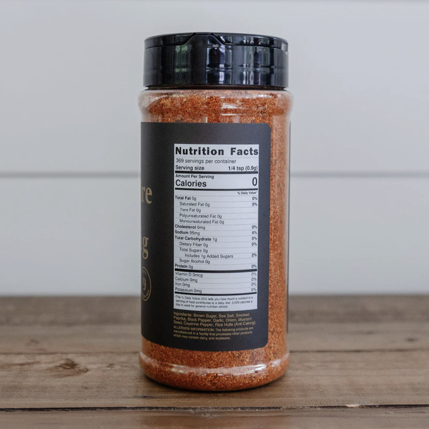 Brown Sugar, Sea Salt, Smoked Paprika, Black Pepper, Garlic, Onion, Mustard Seed, Cayenne Pepper, Rice Hulls (Anti-Caking)