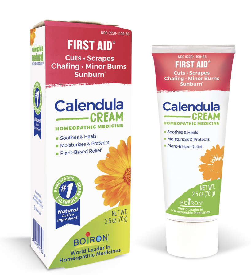 Soothe your skin the natural way. Calendula Cream by Boiron is a plant-powered first aid treatment that heals skin irritations, such as cuts, scrapes, chafing, minor burns, and sunburn.* The light and creamy water-based formula soothes and moisturizes, while the active ingredient, made from fresh Calendula, heals.