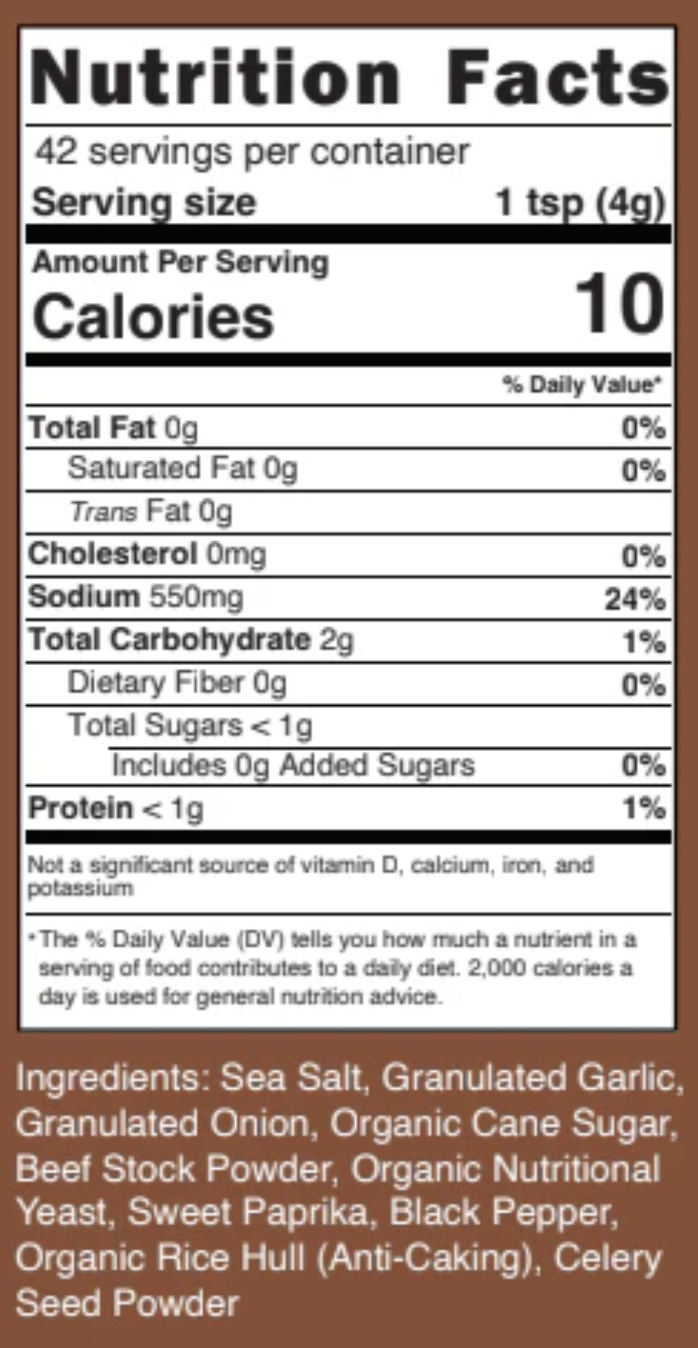 • Sea Salt, Granulated Garlic, Granulated Onion, Organic Cane Sugar, Beef Stock Powder, Organic Nutritional Yeast, Sweet Paprika, Black Pepper, Organic Rice Hull (Anti-Caking), Celery Seed Powder.