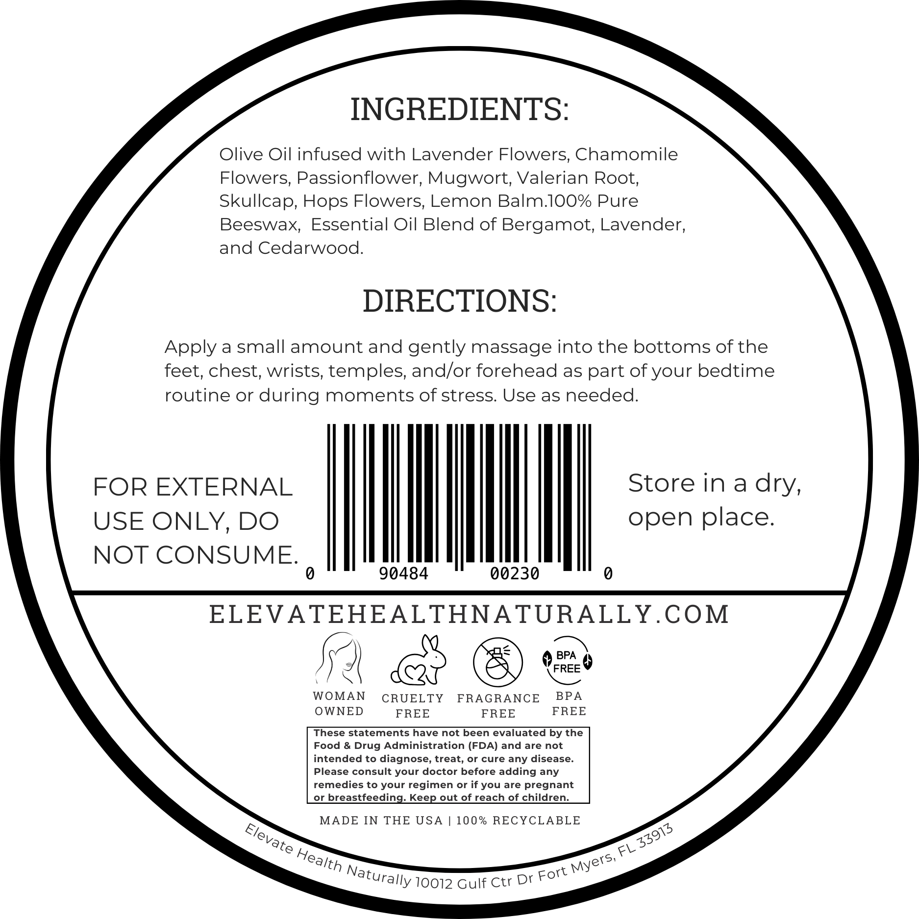 Olive Oil Infused with Lavender Flowers, Chamomile Flowers, Passionflower, Mugwort, Valerian Root, Skullcap, Hops Flowers, Lemon Balm, 100% Pure Beeswax, Essential Oil Blend of Bergamot, Lavender, Cedarwood.