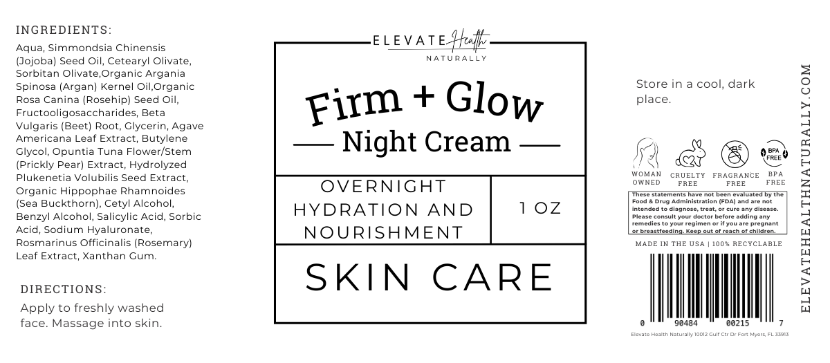 Firm + Glow Night Cream is a nourishing, botanical-rich moisturizer designed to support your skin’s natural overnight renewal. It delivers deep hydration, helps soften the look of fine lines, and supports a firmer, more radiant complexion by morning—without heavy, pore-clogging ingredients.