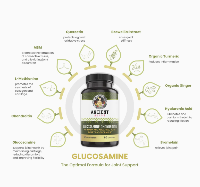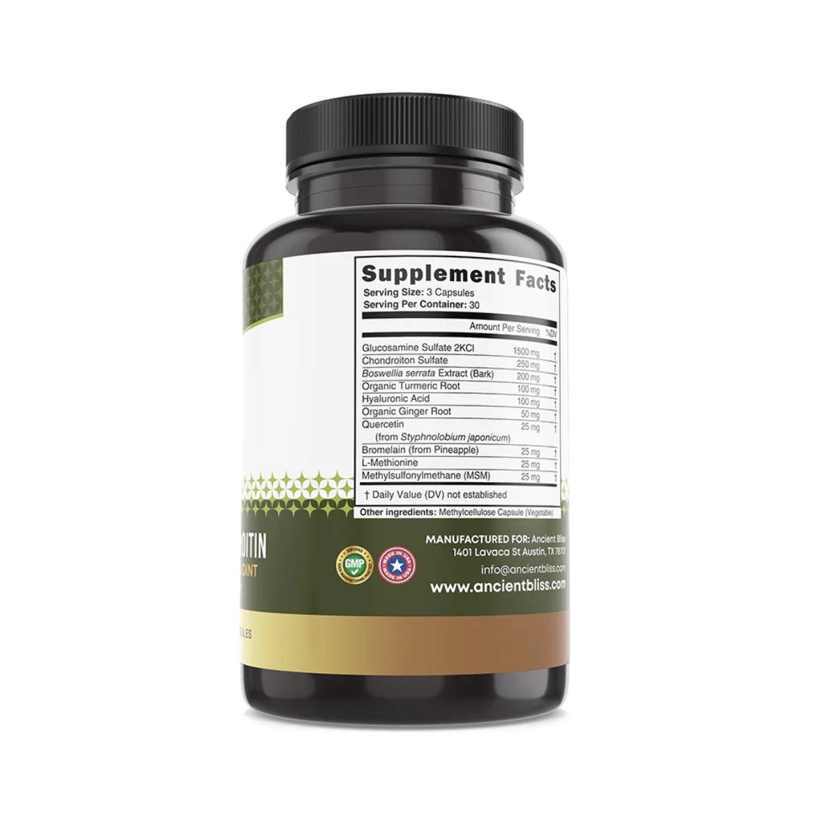 Glucosamine, Chondroitin, L-Methionine, MSM, Quercetin, Boswellia Extract, Organic Turmeric, Hyaluronic Acid, Bromelain, Organic Ginger.
