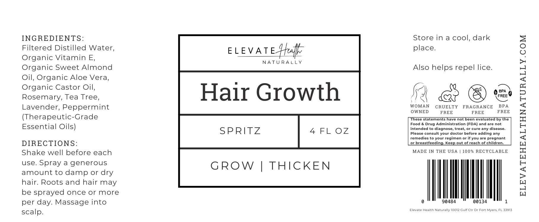 Healthy hair begins at the scalp. Our Elevate Health Naturally Hair Growth Spray was formulated to support a balanced, nourished scalp environment while strengthening hair from root to tip. This lightweight, plant-based spray is designed to improve scalp comfort, support circulation, and protect hair integrity — without harsh chemicals or synthetic additives.