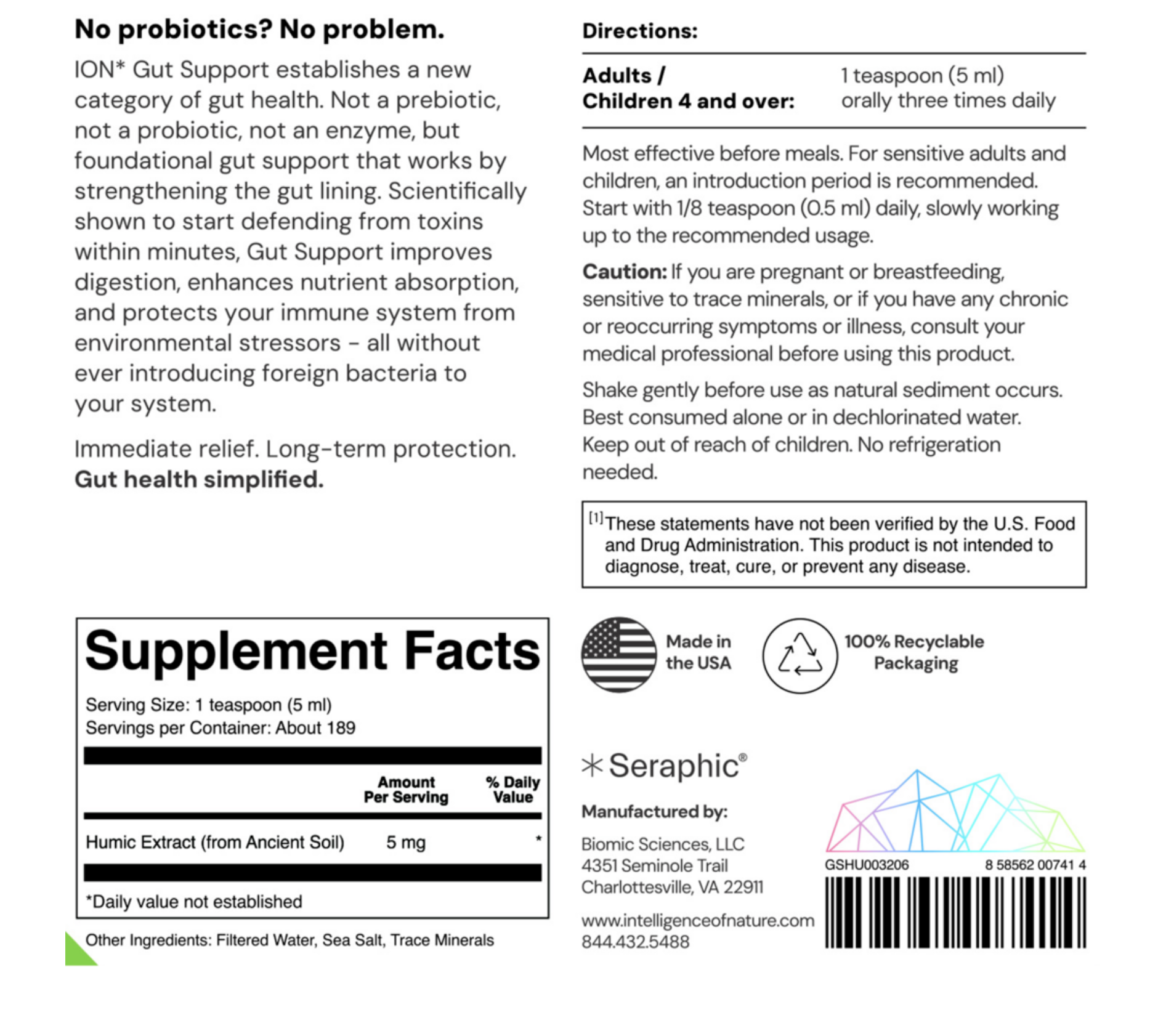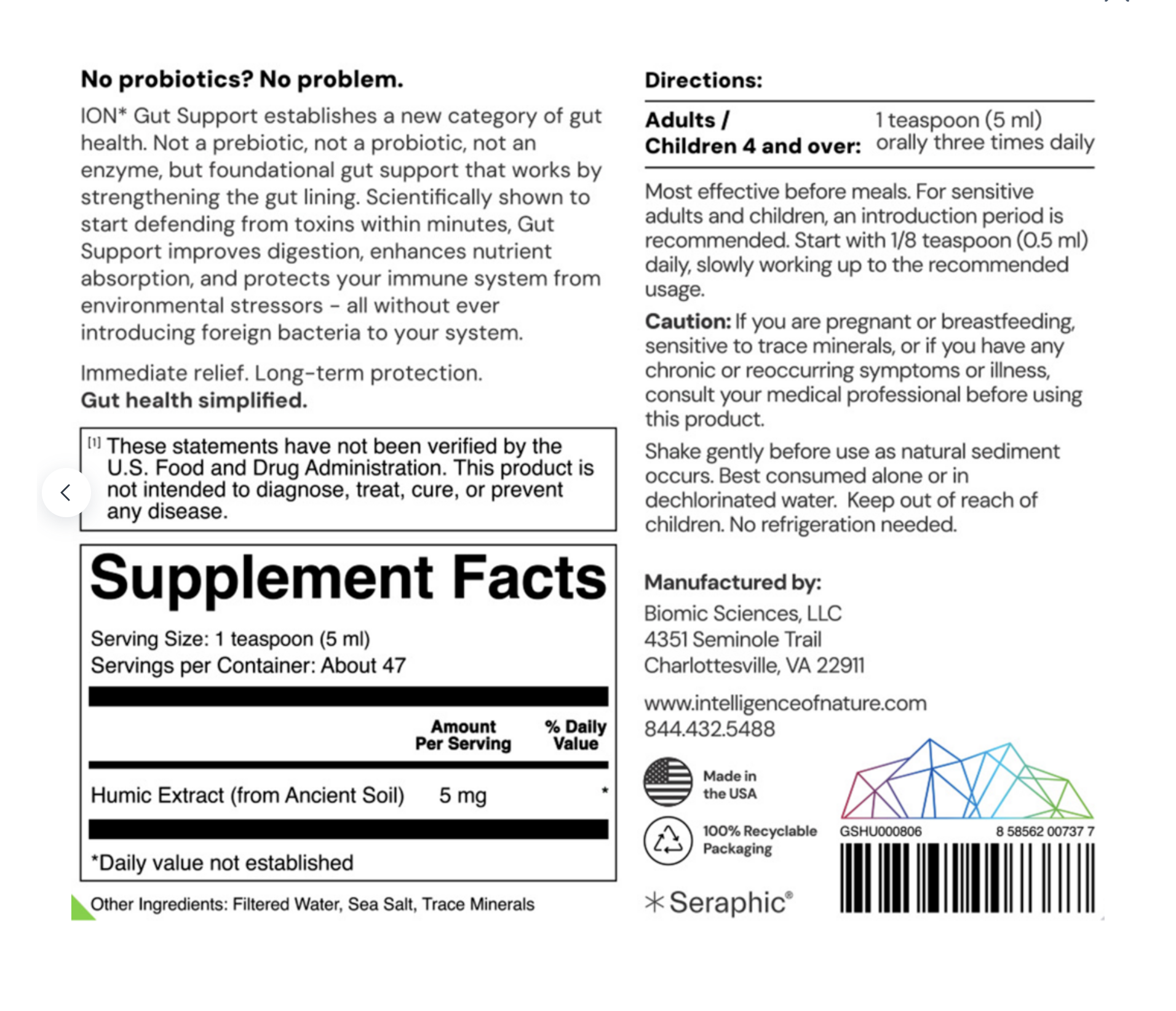 For general gut-brain health, we recommend 1 teaspoon of ION* Gut Support 3x/day. Optimal gut support is achieved when taken 30 minutes prior to meals because of ION* Gut Support’s protective effects against gluten and glyphosate, but you can take it immediately before, with, or after a meal, (or on an empty stomach) and still receive benefit.