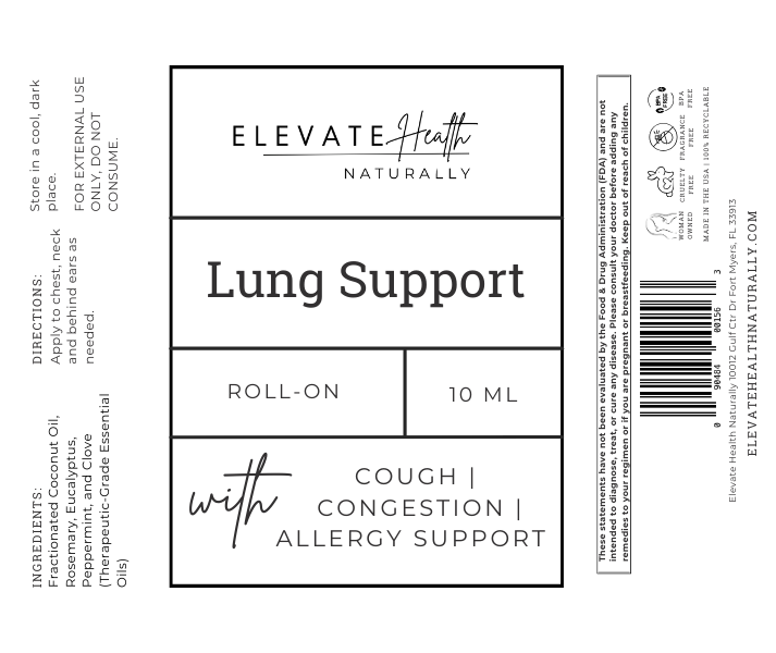 Our Elevate Health Naturally Lung Support Roll-On is a targeted, topical blend created to support respiratory comfort during times of congestion, coughing, or seasonal irritation. Formulated with therapeutic-grade essential oils traditionally used to support clear breathing and inflammatory balance, this roll-on offers fast, localized support without oral supplements or synthetic ingredients. It’s an ideal companion during cold and flu season, allergy flare-ups, or anytime breathing feels restricted or heavy.