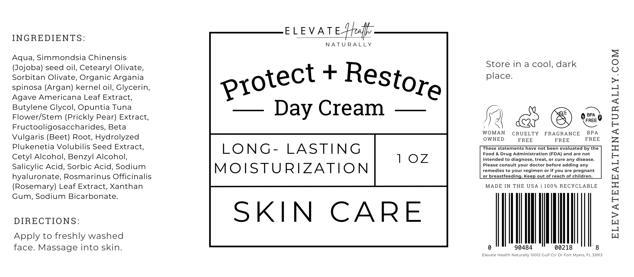 Protect + Restore Day Cream is a lightweight, botanical-rich moisturizer designed to support your skin barrier throughout the day while delivering lasting hydration and a healthy, natural glow. Made for everyday use, it helps skin feel calm, balanced, and comfortably moisturized without heaviness.