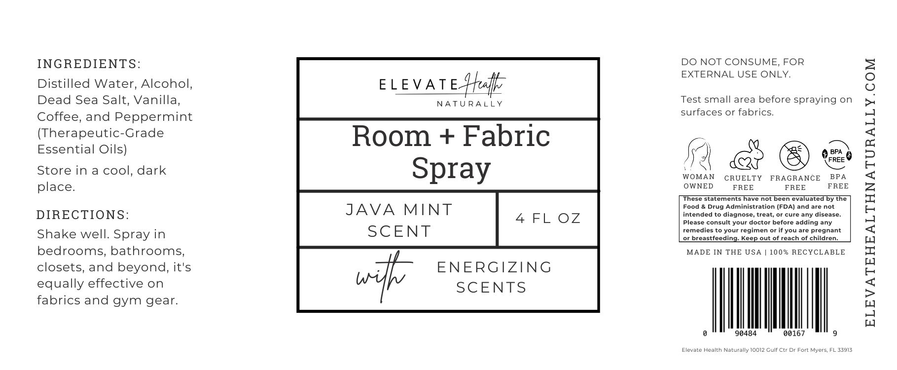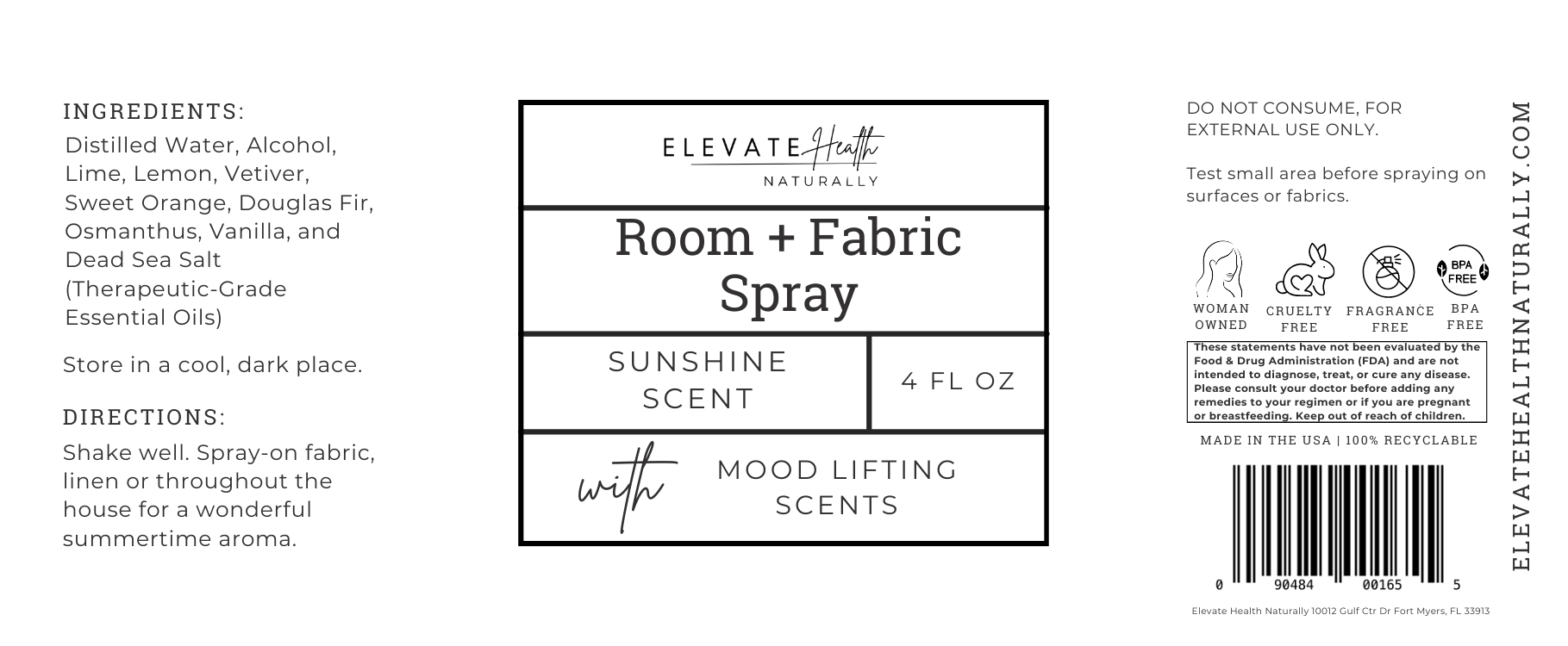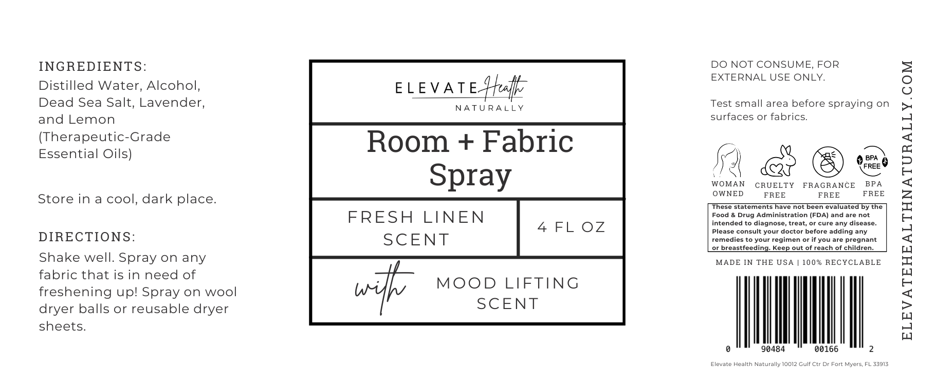 Our Elevate Health Naturally Room + Fabric Spray is a versatile, low-toxin way to freshen your home, fabrics, and everyday spaces without synthetic fragrance or harsh chemicals. Formulated with distilled water, alcohol, mineral-rich Dead Sea salt, and therapeutic-grade essential oils, this spray neutralizes odors while leaving behind a clean, naturally layered aroma. Designed for use throughout the home, it works just as effectively on rooms, linens, clothing, and gym gear.