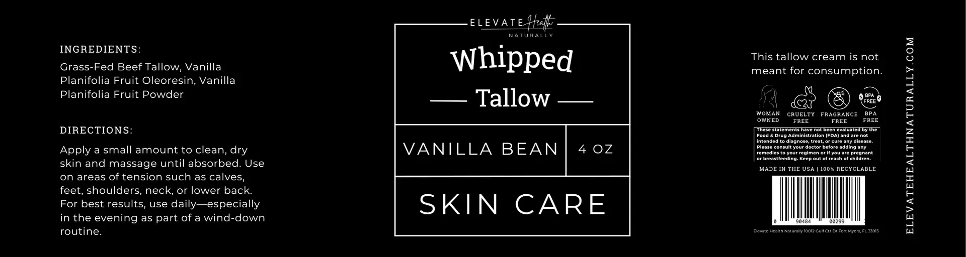 Vanilla Bean: Grass-Fed Beef Tallow, Vanilla Planifolia Fruit Oleoresin, Vanilla Planifolia Fruit Powder.