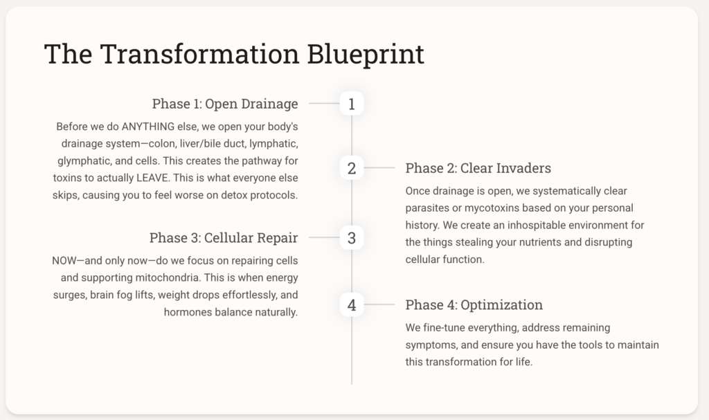 Think about it like building a house. If a contractor showed up and said, “We’re going to start with the roof, then do the walls, and maybe get to the foundation later if we have time”—you’d fire them on the spot. That’s insane. Everyone knows you start with the foundation, then the frame, then the walls, then the roof. Do it out of order and the whole structure collapses. But that’s exactly what’s happening with most health protocols. They’re trying to fix the roof—hormones, energy, metabolism—while the foundation is crumbling underneath. They’re hanging beautiful fixtures and painting walls while the plumbing is backed up and the drainage is broken. We build from the ground up. Foundation first. Every step prepares your body for the next. And when you do it in the right sequence? Everything you build on top of it actually holds.
